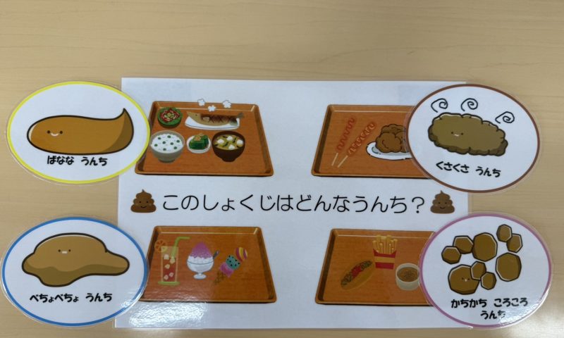 どんなうんちがいいうんちなのか、どうしたらいいうんちが出るか、食べ物でうんちの形やにおいも変わることを知りました!