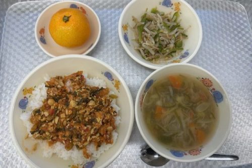 ・食パン(ジャム&マーガリン) ・にらのスープ ・鶏のケチャップ煮 ・オレンジ