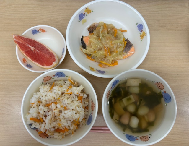 ・五目鶏飯 ・すまし汁 ・鮭のちゃんちゃん焼き ・グレープフルーツ