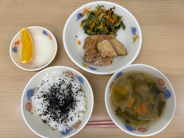・胡麻かけご飯 ・味噌汁 ・鯖の竜田揚げ ・きゅうりの酢の物 ・オレンジ