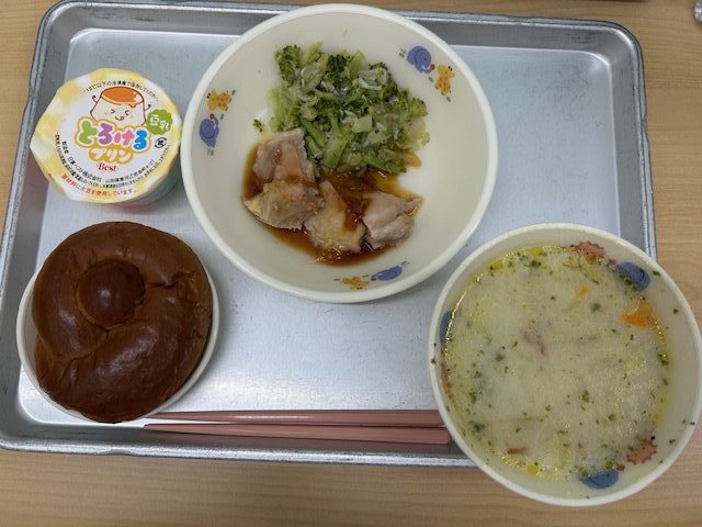 ・黒糖ロール ・クラムチャウダー ・鶏肉のマーマレード焼き ・じゃことブロッコリーのサラダ ・とろけるプリン