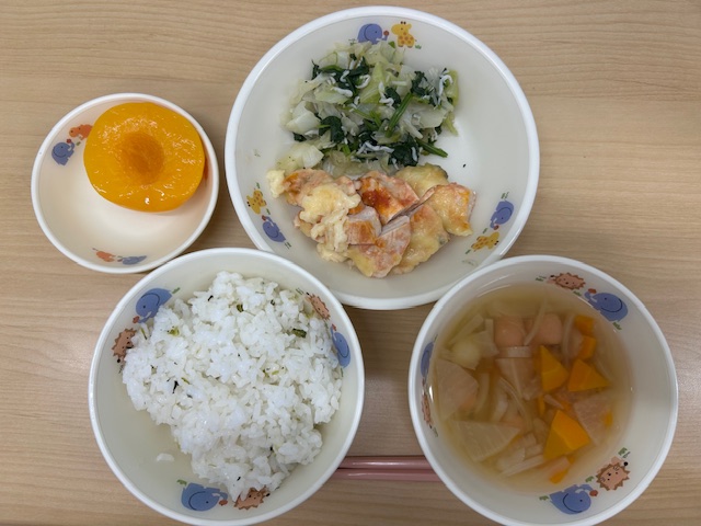 ・菜飯 ・すまし汁 ・鶏チーズ焼き ・しらす和え ・桃缶