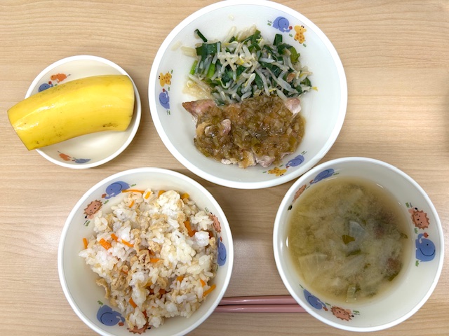 ・油揚げと人参の混ぜご飯 ・味噌汁 ・鶏の甘酢あん ・にらともやしの和え物 ・バナナ