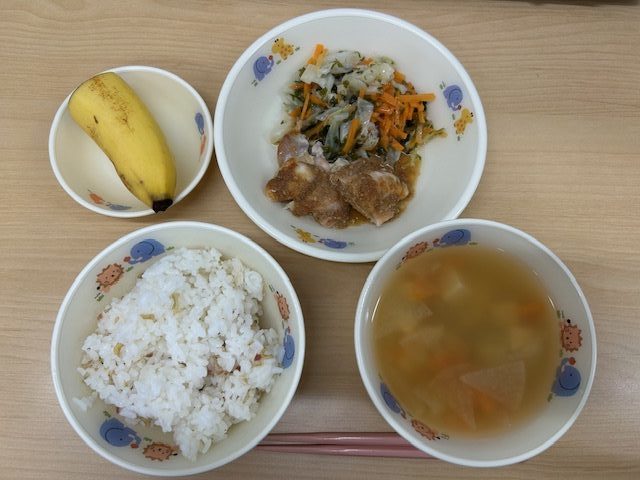 ・うめちりごはん ・いものこ汁 ・鶏のゴマソース焼き ・わかめサラダ ・バナナ