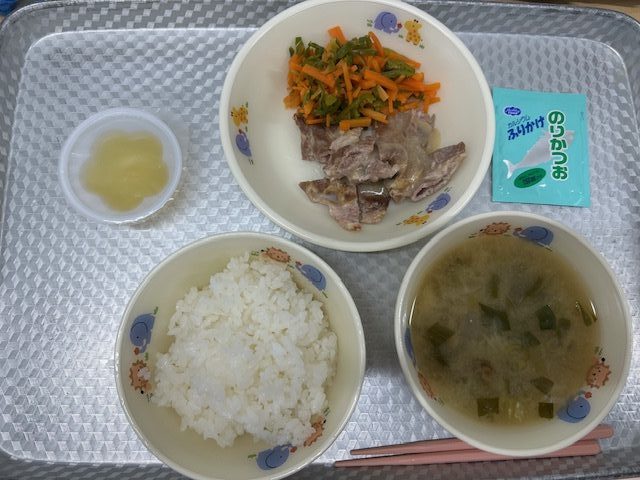 ・ご飯 ・ふりかけ鉄之助 ・味噌汁 ・豚肉の香味焼き ・ピーマンのお浸し ・オレンジゼリー