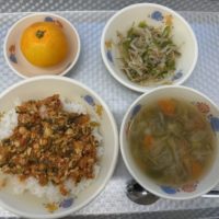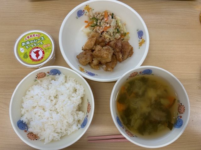 ・ご飯 ・味噌汁(じゃがいも) ・鶏の唐揚げ ・納豆あえ ・お米のムース(ラ・フランス)
