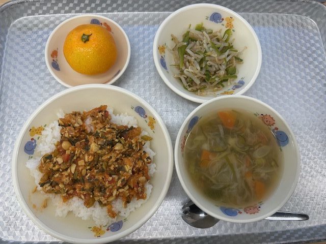 ・ビーンズライス ・長ネギスープ ・ピーマンともやしのお浸し ・みかん