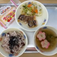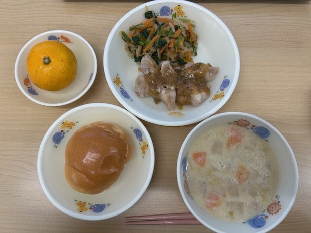 ・バターロール ・豆乳スープ ・鶏のバーベキューソース焼き ・いろどり野菜 ・みかん