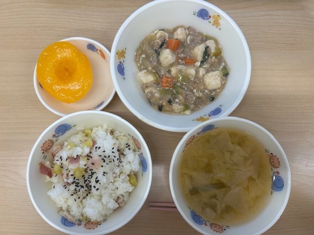 ・さつま芋とベーコンご飯 ・味噌汁 ・五目豆腐 ・桃缶