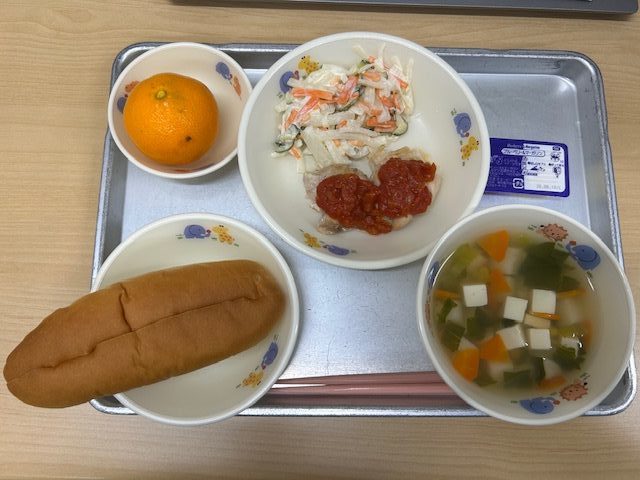 ・ホットロール(ジャム&マーガリン) ・コーン入り野菜スープ ・鶏肉トマトソース焼き ・大根サラダ ・みかん