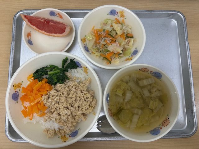 ・そぼろ丼 ・すまし汁 ・ツナサラダ ・グレープフルーツ