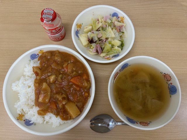 ・根菜のカレー ・味噌汁 ・りんごサラダ ・ヤクルト