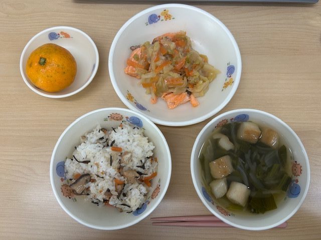 ・五目鶏飯 ・すまし汁 ・鮭のちゃんちゃん焼き ・みかん