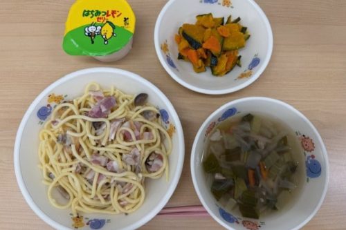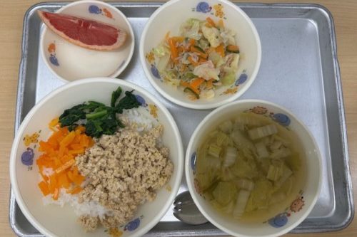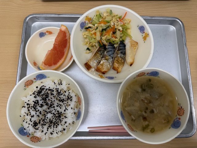 ・胡麻かけご飯 ・きのこ汁 ・鯖の香り焼き ・キャベツと油揚げの和え物 ・グレープフルーツ