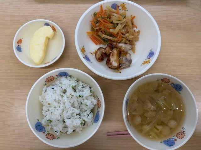・菜飯 ・味噌汁 ・鶏肉の照り焼き ・人参と大根の金平 ・りんご