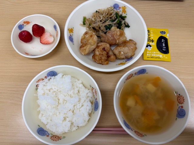 ・ご飯 ・カルシウムふりかけ ・味噌汁 ・塩唐揚げ ・にらともやしの和え物 ・いちご