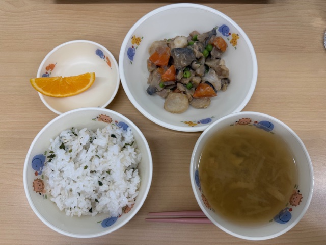 ・若布ご飯 ・味噌汁 ・炒り鶏 ・オレンジ